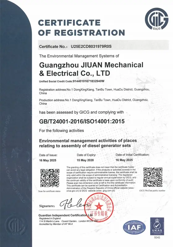 تحمل شركة Jiuan تفويضات رسمية من جميع الشركات الكبرى المصنعة للمحركات، مما يعكس اعتراف بكفاءتنا ومصداقيتنا، ويؤكد التزامنا تجاه عملائنا. يتم تصنيع كل مجموعة مولدات باستخدام مكونات أصلية وقابلة للتتبع، وتخضع لرقابة جودة واختبارات صارمة لضمان أداء مستقر وموثوق يلبي المعايير الدولية.